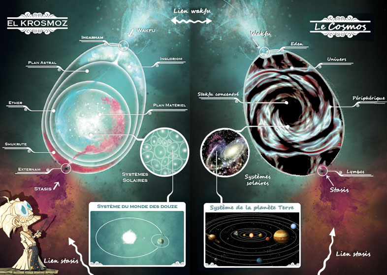 Le Krosmoz ressemble à un gigantesque dofus. Le wakfu pénètre par le haut, et le stasis par le bas. La Shukrute et l'Ingloriom empêchent en grande partie ces deux substances de se déverser à flot, ce qui évite des trop grandes concentrations. Ensuite, le Plan Astral et l'Ether permettent encore une fois de bien rediriger les flux d'énergie, pour garder un bon état d'équilibre au sein du Plan Matériel, c'est-à-dire là où nous vivons. Moi et Wayh supposons que le Cosmos était presque identique à cela, il y a très longtemps. Puis, il y a approximativement 13,7 milliards d'années, il y eut une explosion. Une déformation, une anomalie, personne n'a pu l'expliquer. Mais les humains ont appelé cet évènement le Big Bang.